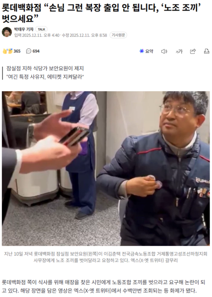 11일 전국금속노동조합과 롯데백화점 쪽의 설명을 종합하면, 지난 10일 저녁 7시께 금속노조 거제통영고성조선하청지회 조합원 8명 등 11명은 서울 송파구 롯데백화점 잠실점을 방문했다. 백화점 부근 쿠팡 사옥 앞에서 열린 집회 참석 뒤 저녁 식사를 위해 백화점 지하 식당가를 찾은 것이다. 이들은 식당 입구에서 백화점 보안요원한테 “이런 복장으로는 출입할 수 없다”는 제지를 받았다고 한다. 현장에 있던 이김춘택 조선하청지회 사무장은 한겨레와 한 통화에서 “금속노조 조끼를 입고, ‘투쟁 머리띠’가 달려 있는 모자를 쓰고 있었다. 조끼와 모자를 벗어달라고 하더라”며 “밥 먹으러 왔는데 왜 못 들어가냐고 항의했다”고 말했다. 테이블에 앉았을 땐, 보안요원 2명이 재차 조끼를 벗어달라고 요청했다. 해당 영상에 그 장면이 담겼다. 이를 보면, 이김 사무장이 “조끼 입었다는 이유로 이런 취급을 받아야겠습니까”라고 하자 보안요원은 “공공장소에서는 에티켓을 지켜주셔야 한다”고 말했다. 이김 사무장이 “우리는 공공장소에서도 다 이렇게 다닌다. 조끼를 벗으라는 것은 노동자에 대한 혐오다”라고 맞받자 이번엔 “여기는 사유지니까”라고 보안요원의 답이 돌아왔다. 일행들의 항의가 이어지자 “나도 노동자다”라고 했던 보안요원은 “좀 부탁드릴게요”라고 말하며 난처해 했다. 이김 사무장은 한겨레에 “백화점 쪽의 말은 ‘이런 복장으로는 출입할 수 없는게 우리 규정’이라며 ‘주변 사람에게 불편함을 줄 수 있다’는 것이었다”며 “5~10분 실랑이를 하다가 몇 명은 밥도 못 먹고 먼저 자리를 떠야 했고, 보안요원들이 간 뒤에야 식사를 할 수 있었다”고 했다. 그는 이어 “브이아이피(VIP)를 위한 공간도 아니고 식당에서, 어떤 일을 한 것도 아니고 조끼를 입었다고, 이런 취급을 하는 것은 기업의 노동조합과 노동자에 대한 혐오라고 생각한다”고 했다. .. 후략 ..