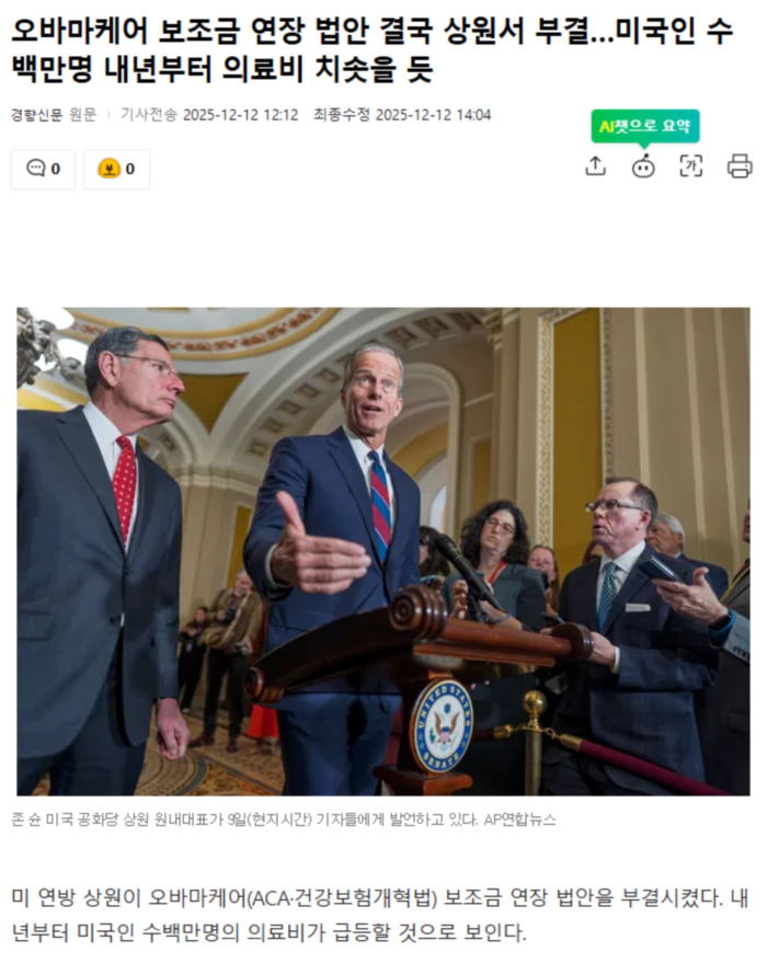 미 상원은 11일(현지시간) 민주당이 발의한 오바마케어 보조금 3년 연장 법안을 표결에 부쳤으나, 찬성 51 대 반대 48로 부결됐다. 공화당에서 수전 콜린스(메인), 리사 머코스키 의원(알래스카), 댄 설리번(알래스카), 조시 홀리(미주리) 의원 등 4명의 이탈표가 나왔지만, 법안 통과에 필요한 60표에는 미치지 못했다. 민주당은 지난 10월 오바마케어 보조금 연장을 요구하며 연방정부 셧다운(일시 업무중지)까지 불사했으나, 내부 분열로 인해 아무런 양보도 얻어내지 못한 채 지난달 셧다운 해제에 합의했다. 겨우 약속받은 것이 표결 기회였지만 그마저도 부결되면서 민주당의 싸움은 허무하게 막을 내리고 말았다. 민주당과 함께 찬성표를 던진 머코스키 공화당 상원의원은 표결 후 “우리는 실패했다”면서 “더 잘했어야 했다. (내년 의료비 급등을 앞두고) ‘새해 복 많이 받으라’는 인사만 해선 안 된다”고 말했다. 보건정책 연구단체인 카이저패밀리재단에 따르면 보조금이 종료될 경우 가입자의 보험료는 평균 2~3배가량 상승할 것으로 전망된다. 의회예산국(CBO)은 약 200만명이 무보험 상태에 놓이게 될 것으로 예상했다. 의료비 급등이 현실화하면 이는 내년 중간선거에서 공화당에 큰 악재가 될 것으로 보인다. 이에 공화당은 보조금을 없애는 대신 세제 혜택이 적용되는 건강저축계좌(HSA)를 확대하고, 저소득층에 최대 1500달러(약 221만원)의 현금을 지급하는 법안을 대안으로 제시했다. 트럼프 대통령은 오바마케어 보조금이 보험사 배만 불리면서 연방정부 예산에 감당할 수 없는 부담을 지운다고 비판해왔다. 그러면서 국민에게 직접 보조금을 지급하는 방안을 지지해왔다. 하지만 민주당 법안과 함께 이날 표결에 부쳐진 공화당 법안도 찬성 51 대 반대 48로 부결됐다. 민주당은 건강저축계좌로는 고령자나 질환자의 의료비 부담을 완화하기 충분치 않다고 반발했다. 실제 “현금만 주면 된다”는 아이디어는 의료 시장 현실과 거리가 멀다. 건강보험의 핵심 개념은 의료비 부담을 줄이기 위해 가입자 집단 전체에 위험을 분산하는 것이다. 보험 가입 규모를 키우면 건강한 가입자의 보험료로 고령자나 질환이 있는 가입자의 의료비 부담을 상쇄하는 것이 가능하다. .. 후략 ..