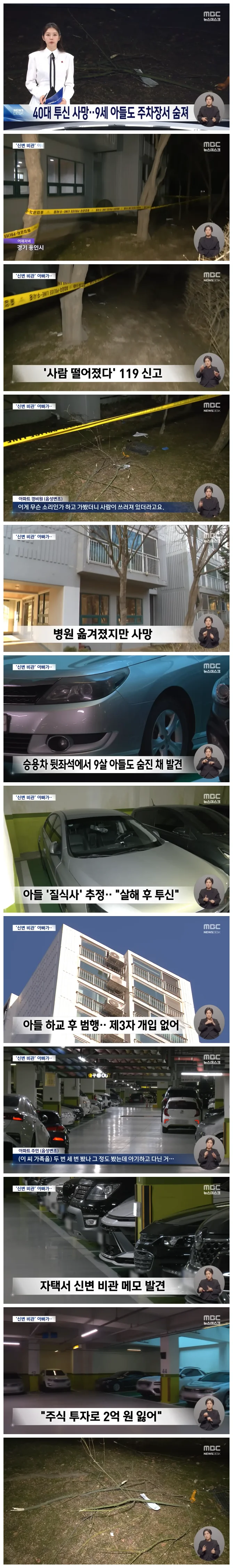어제(12/11) 저녁 경기 용인의 한 아파트에서는 40대 남성이 투신 사망하고, 남성의 차에서는 9살 아들이 숨진 채 발견됐습니다.