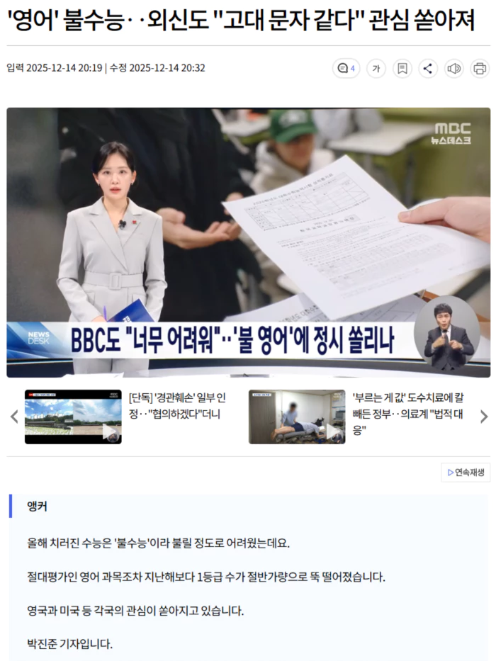 영국의 BBC가 올해 한국 수능 영어 시험과 관련해 이례적으로 보도했습니다.