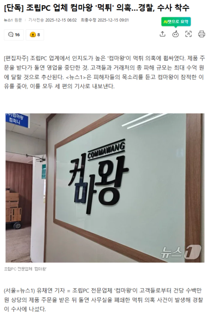 15일 뉴스1 취재를 종합하면 서울 용산경찰서는 사기 등 혐의를 받는 컴마왕 대표 한 모 씨 등을 수사 중이다.