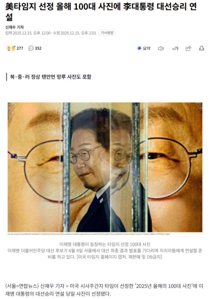 14일(현지시간) 타임지가 홈페이지에서 공개한 100대 사진 중 이 대통령의 사진은 지난 6월 4일 더불어민주당 대선 후보로서 대선 최종 결과 발표를 앞두고 지지자들에게 연설하기 직전의 모습을 담고 있다.