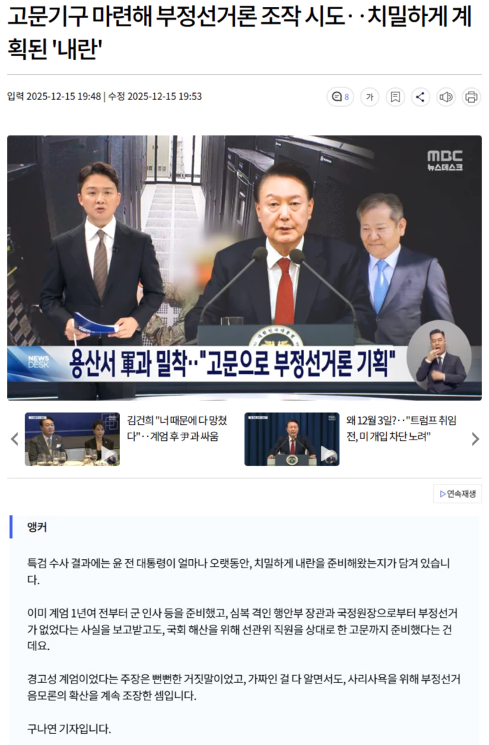 [리포트] 취임과 동시에 대통령실을 국방부 청사로, 관저를 한남동으로 이전한 윤 전 대통령. 대통령과 군이 밀착되는 여건이 만들어지며, 계엄 선포를 위한 준비는 수월해졌습니다. 특검은 계엄 준비가 본격화한 시점으로 2023년 10월 군 장성 인사를 지목했습니다. [조은석/'내란' 특별검사] "김용현과 노상원은 2023년 10월 군 인사를 앞두고 '육군참모총장, 방첩사령관, 지상작전사령관' 등 군 인사방안과 비상계엄 시 진압군이 될 수 있는 9사단과 30사단에 대하여 논의하였고‥" 육군참모총장에 박안수, 방첩사령관에 여인형, 지상작전사령관에 손식 대장이 보임되면서 계엄 구상은 현실화됐습니다. 이때부터 계엄 시점과 방법에 대한 구체적인 논의가 시작됐습니다. 윤 전 대통령과 김용현 당시 경호처장은 비상계엄 선포 시점을 총선 후로 정했고, 군 사령관들에게 계엄의 필요성을 주지시키는 작업에 돌입했습니다. [조은석/'내란' 특별검사] "2024년 3월경부터 안가와 관저 등에서 만찬 등을 통해 우호적이지 않게 전개되고 있는 정치상황을 종북좌파 등에 의한 국가적 위기 상황으로 인식하도록‥" 윤 전 대통령은 계엄 반대 의사를 강하게 드러낸 신원식 당시 국방장관을 교체하고, 그 자리를 김용현으로 채웠습니다. 그리고 계엄 선포의 명분을 쌓기 위해 북한의 무력도발을 유인하는 여러 군사 작전을 실행했습니다. 2022년 11월 국민의힘 지도부와의 만찬에서 "비상대권이 있다. 총살당하는 한이 있더라도 싹 쓸어버리겠다"고 발언하는 등, 정치적 반대세력에 대한 적대감을 수시로 드러내 온 윤 전 대통령. .. 후략 ..