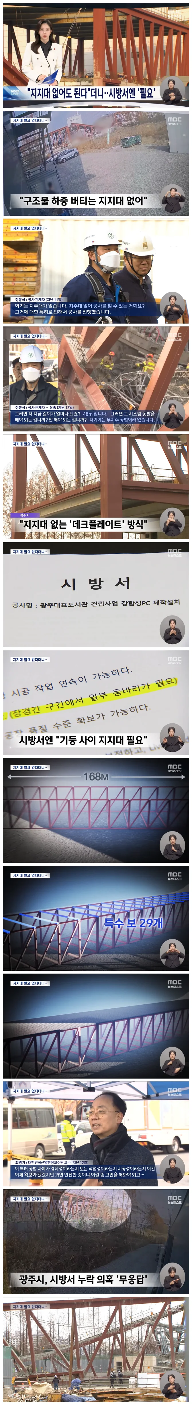 무너진 구조물 공사가 지지대 없이 이뤄졌는데, 그동안 광주시와 시공사에선 지지대가 필요없는 특허공법이라고 해명해 왔습니다.