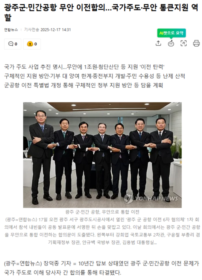 정부가 주도해 이전 논의가 탄력을 받게 된 가운데, 정부의 구체적인 지원 방안 등 과제도 여전하다. 광주 군 공항 이전 당사자인 6자(광주시·전남도·무안군·기재부·국방부·국토부) 협의체는 17일 첫 회의를 열어 정부 지원 방안 등을 담은 합의문을 발표했다. 합의문에는 정부·광주시의 무안 지원, 무안국제공항의 김대중 공항으로의 명칭 변경 등이 명시됐다. 합의문에서 "정부는 (군공항 이전 합의) 공동발표문이 국가 균형 발전에 중요한 과제임을 확인하며 완전한 이행을 보장하기 위해 적극 지원하고 최선의 노력을 다하기로 한다"고 밝혀 정부의 사업임을 명확히 했다. 이전 후보지인 무안에는 정부와 광주시의 대대적인 지원이 이뤄진다. 무안에는 광주시의 자체 조달과 정부의 정책적 지원을 포함해 1조원의 자금이 지원된다. 또한 국가농업 AX(인공지능 전환) 플랫폼 구축, 에너지 신산업, 항공 MRO 센터 등 첨단 산업 기반이 조성되고 기업이 유치된다. 정부는 무안국제공항을 서남권의 거점공항으로 육성하겠다는 방안을 명확히 했다. 그동안 무안군이 군공항 이전에 반대하며 정부와 광주시의 지원을 확약해달라고 했는데, 이번 합의문에 이러한 약속이 담겨 무안군의 수용성을 높였다는 평가가 나온다. 하지만 이번 합의에는 정부 지원이 명시됐을 뿐 구체적인 지원 방안이 담기지 않아 정부 주도로 사업이 제대로 추진될지 우려의 목소리도 나온다. 특히 광주시가 무안에 지원하는 1조원의 막대한 자금에 대한 지원 방안이 나오지 않았다. 정부, 광주시 등은 구체적인 지원 방안이 논의되고 있다며, 6자 협의 등을 통해 마련하겠다고 밝혔다. 1조원은 정부 3천억원, 광주시 1천500억원, 기부 대 양여 충당금 5천500억원 등으로 충당하는 방안이 논의되온 것으로 전해졌다. 기존 기부 대 양여 방식의 한계를 어떻게 극복하느냐도 관건이다. 기부 대 양여는 광주시가 새 군공항을 건설해 국방부에 기부하고, 국방부는 기존 군공항 부지와 시설을 광주시에 넘기는 방식이다. 현재 이전사업 총사업비는 5조7천억원으로 추산된다. 새 군공항 건설비 4조791억원, 이전지역 지원사업비 최소 4천500억원, 종전부지 개발비 8천356억원, 금융비용 3천825억 원 등이다. 그러나 땅값 상승, 공사비 증가 등 여러 변수를 고려하면 총사업비는 7조 원을 넘어 10조 원까지도 거론된다. 국방부는 총사업비 재산정에 착수한 상태다. 광주시의 재정 여건을 감안하면 추가 지원이 불가피하다는 요구가 커지고 있다. 종전 부지 개발 문제도 만만치 않다. 광주시는 종전 부지에 인공지능(AI)·빅테크 중심의 '광주형 실리콘밸리' 구상을 제시했으나, 부동산 경기 침체, 보상 문제 등이 발목을 잡을 수 있다는 우려가 있다. 금융비용 등 정부의 구체적인 지원 방안을 담은 '광주 군공항 이전 특별법' 개정이 필요하다는 요구가 크다. .. 후략 ..