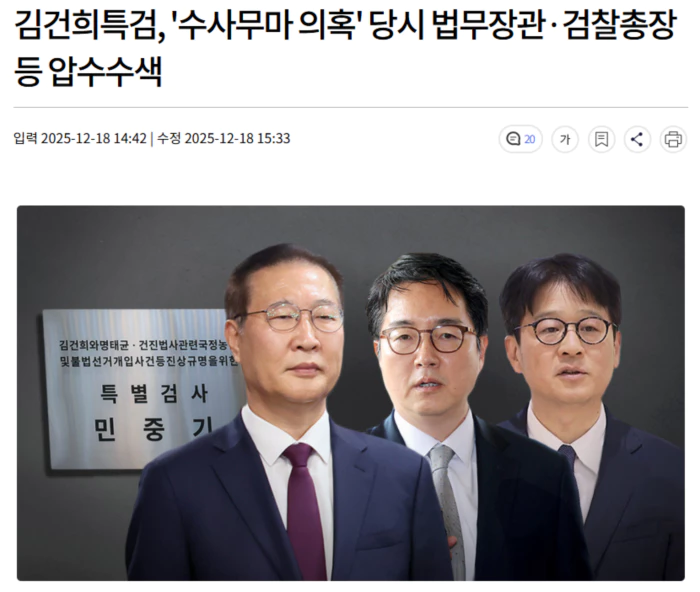 특검팀은 오늘 언론브리핑을 통해 "김건희 씨 디올백 수수와 도이치모터스 주가조작 사건 처분 당시 법무부장관과 대통령실 민정수석, 검찰총장과 서울중앙지검장, 서울중앙지검 제4차장 및 디올백 수수 사건 수사라인 검사들의 사무실과 휴대폰 PC 등에 대해 압수수색에 착수했다"고 밝혔습니다.