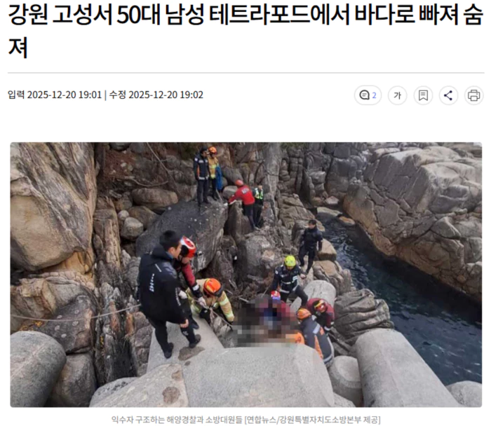 오늘(12/20) 오전 7시 35분쯤 강원도 고성군 죽왕면 백도항 테트라포드에서 50대 남성이 바다에 빠졌습니다.