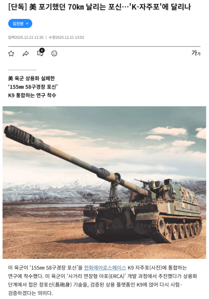 방산업계에선 “미 육군 자주포 현대화 사업에서 한화에어로스페이스가 기술·운용 데이터 선점 효과를 거두면서 한층 유리한 고지를 점력하게 됐다”는 평가가 나온다. 21일 방산업계에 따르면 미 육군 전투역량개발사령부(DEVCOM) 산하 무장센터(DEVCOM-AC)는 한화에어로스페이스의 미국 자회사 한화디펜스USA와 이같은 내용의 협력 연구·개발 협정(CRADA)을 체결했다. 이번 협정의 핵심은 미 정부가 설계한 58구경장 포신을 K9 계열 자주포에 통합하는 것이다. 155㎜ 58구경장 포신은 구경(탄의 지름) 155㎜를 기준으로 포신 길이가 그 58배(약 9m)라는 뜻이다. 북대서양조약기구(NATO) 표준으로 널리 쓰이는 52구경장(약 8m)보다 더 길다. 포신이 길어지면 탄이 포신 내부에서 추진가스 압력을 받는 시간이 늘어난다. 초기탄속이 빨라지고, 같은 탄·장약 조건에서도 사거리와 탄도 안정성을 끌어올릴 수 있다. 업계에선 52구경장 자주포가 통상 40㎞ 안팎의 사거리를 보이는 데 비해, 장포신과 신형 탄약을 조합하면 70㎞급 사거리를 확보할 수 있을 것으로 본다. 미 육군은 2018년부터 ERCA 프로젝트를 통해 58구경장 포신 개발을 추진했다. 하지만 시제 포격 시험에서 비교적 적은 발사 횟수에도 포신이 과도하게 마모되는 문제가 생겼다. 미 육군은 이에 지난해 ERCA 프로그램을 중단했다. 이후 미 육군은 차기 자주포를 ‘새로 개발’하기보다, 단기간에 전력화가 가능한 상용 체계를 대상으로 성능을 검증해 조달로 이어가는 쪽으로 방향을 틀었다. 한화에어로스페이스 등 복수 업체를 대상으로 기술 검증을 진행했다. 이 과정에서 58구경장 포신을 K9 플랫폼에 통합해 신형·첨단 탄약과 결합하는 시나리오가 유력한 대안으로 떠올랐다. .. 후략 ..