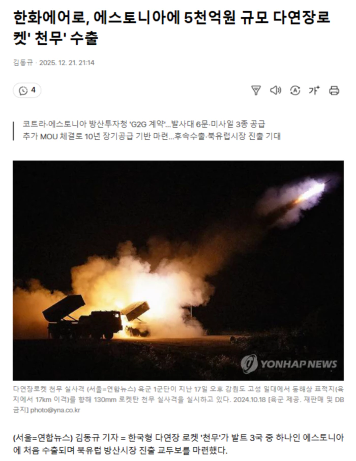 대한무역투자진흥공사(코트라)는 21일(현지시간) 에스토니아 탈린 전쟁박물관에서 에스토니아 국방부 산하 방산투자청(ECDI)과 '천무 다연장 로켓 시스템 공급을 위한 정부 간(G2G) 수출계약'을 체결했다고 밝혔다. 한화에어로스페이스는 총 3억유로(약 5천200억원) 규모의 천무 발사대 6문 및 미사일 3종을 앞으로 3년간 에스토니아에 공급하기로 했다. 천무는 한반도 유사시 북한의 방사포와 장사정포 위협에 대응해 우리 군이 수행하는 핵심 화력장비로, 최대사거리 80㎞에서 고폭 유도탄과 분산 유도탄 발사가 가능하다. 유럽에서는 러시아·우크라이나 전쟁에서 장거리 정밀 타격 능력의 필요성이 확인된 상황에서 화력 공백을 메울 설루션으로 주목받고 있다. 천무 수출 계약은 유럽에서는 폴란드에 이어 두 번째로 체결된 것이자 발트해 국가를 대상으로 처음 거둔 수출 성과다. 앞서 에스토니아는 지난 2018년 한화에어로스페이스와 K-9 자주포 도입 계약을 맺은 것을 시작으로 총 36문 도입 계약을 체결하며 K-방산과 인연을 맺은 바 있다. 이번 계약에 앞서 양국 국방장관은 지난 10월 서울에서 '천무 획득에 관한 양해각서'를 체결하는 등 방산 협력 강화를 위한 협의를 지속해왔다. 에스토니아 정부는 '국방개발계획 2026-2029(KMAK)'에 따라 향후 4년간 100억유로(약 17조3천500억원) 이상을 국방 역량 강화에 투자할 계획이다. 코트라는 이번 계약이 에스토니아 방산 프로젝트 후속 수주에도 유리하게 작용할 것으로 기대했다. .. 후략 ..