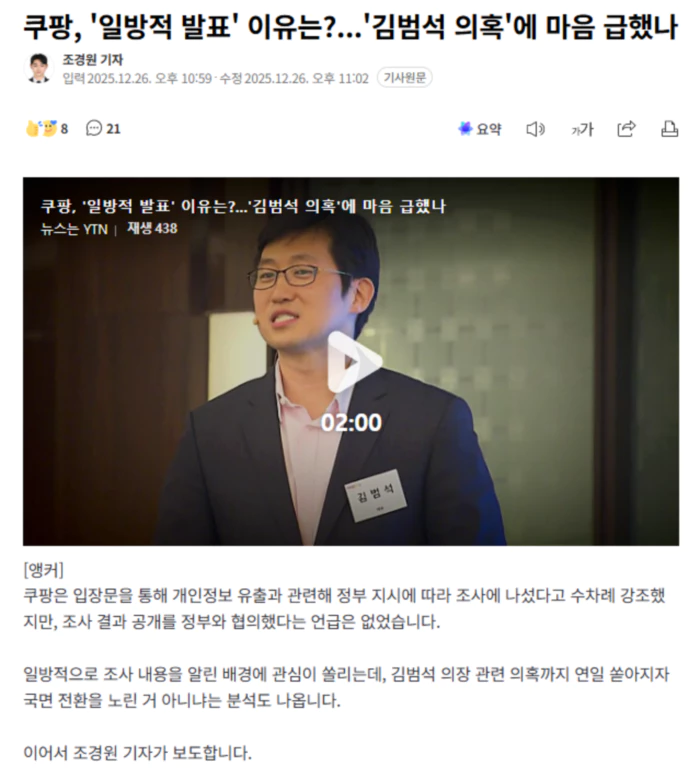 [기자] 쿠팡이 성탄절 휴일에 개인정보 유출 사태 관련 조사 결과를 발표한 데 대해 정부는 쿠팡의 '주장'이라고 규정하면서 사전 협의가 없었던 발표라는 점을 분명히 했습니다. 쿠팡 입장문에도 조사 결과 공개 여부를 정부 측과 협의했다는 내용은 찾아볼 수 없습니다. 쿠팡의 느닷없는 발표 배경을 두고, 한국과 미국에서 동시다발적으로 진행 중인 집단 소송이 영향을 미쳤을 거라는 관측도 나옵니다. 애초 알려진 유출 규모는 3천370만 건, 이를 조사 결과 3천 건이었다고 주장하는 건 배상액을 줄이기 위한 시도라는 시각입니다. [곽준호 / 변호사 : (내용이) 사실이라 치면 그런 부분이 참작돼서 손해 배상액 규모가 다소 좀 줄어들 것으로 보입니다.] '산업재해 은폐 의혹' 등 김범석 의장을 둘러싸고 연일 불거지는 폭로가 부담됐다는 분석도 있습니다. 쿠팡의 전직 최고위직을 통해 개인 대화 내용까지 언론에 고스란히 노출되고, 결국 김 의장이 고발돼 수사까지 받을 처지에 놓이자 국면 전환을 노린 것 아니냐는 해석입니다. 하지만 섣부른 발표로 인한 혼란이 불 보듯 뻔한 상황에서 쿠팡이 자기 이익을 위해 무리수를 둔 것이라는 지적이 나옵니다. .. 후략 ..