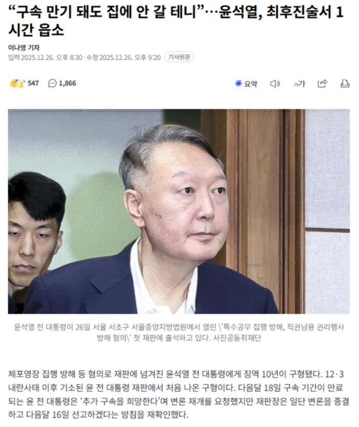 26일 서울중앙지법 형사35부(재판장 백대현) 심리로 열린 윤 전 대통령의 특수공무집행방해, 직권남용권리행사방해, 허위공문서작성 등 혐의 결심공판에서 조은석 특별검사팀은 “공소사실 전부에 대해 합리적 의심 없이 증명됐다”며 “징역 10년을 선고해달라”고 밝혔다. 특검팀은 체포영장 집행 방해 혐의로 징역 5년, 국무위원 심의권 침해와 비화폰 관련 증거인멸, 비상계엄 허위 공보 혐의로 징역 3년, 비상계엄 선포문 사후 작성 혐의로 징역 2년을 선고해달라고 요청했다. 윤 전 대통령은 △12·3 비상계엄 선포 이후 고위공직자범죄수사처의 체포영장 집행을 저지하고 △계엄 선포 국무회의에 일부 국무위원만 불러 회의에 불참한 국무위원에 대한 심의권을 침해했으며 △비상계엄 선포문을 사후에 작성한 뒤 문건을 폐기하게 한 혐의를 받는다. 또 군 사령관들의 비화폰 기록을 삭제하게 하고, 외신기자들에게 비상계엄 선포에 대한 허위 사실을 알린 혐의도 있다. 박억수 특별검사보는 이날 최종 의견에서 “피고인은 본건 범행에 대해 대수롭지 않은 듯한 태도를 보이며 이런 행위로 대통령을 구속하는 게 유치하다고까지 주장했다”며 “피고인이 자신의 범행을 은폐하고 정당화하기 위해 국가기관을 사유화한 중대 범죄”라고 밝혔다. 박 특검보는 “우리 헌법은 대통령의 권력행사 통제장치로 국무회의 심의제도와 대통령의 국법상 행위에 대해 문서주의와 부서주의를 규정한다”며 “제왕적 대통령제를 바꾼다는 명목으로 대통령실을 청와대에서 용산으로 옮긴 피고인이 제왕적 대통령제의 견제 장치를 전혀 따르지 않았다”고 했다. 이어 “피고인이 수사와 재판 과정에서 국민들에게 반성과 사죄하는 마음을 전하기보다 비상계엄 선포의 정당성, 수사 절차의 위법성을 주장하면서 범행을 전면 부인하고 하급자에게 책임을 전가했다”며 “피고인으로 인해 훼손된 헌법질서와 법치주의를 바로세우고, 다시는 최고권력자에 의한 권력 남용 범죄가 재발하지 않도록 엄중한 책임을 물어야 한다”고 밝혔다. 윤 전 대통령은 이날 1시간 동안 최후진술에서 자신의 혐의가 죄가 되지 않는다며 적극 방어했지만 특검팀의 지적처럼 국민을 향한 사과는 없었다. 그는 “우리나라 역사를 보면 비전시계엄을 상당히 많이 했다. 비전시계엄은 어느 상태에서 실행했던 것보다 심각한 문제라고 생각해서 국가 비상사태를 선포했다”고 주장했다. 그러나 대한민국 역사에서 12·3 사태 이전 평시에 전국 비상계엄이 선포된 건 1961년 5월(5·16), 1972년 10월(10월 유신), 1979년 10월(부마민주항쟁 및 10·26) 3차례뿐으로 모두 군부독재 시절의 일이었다. 윤 전 대통령은 독재 시절 사례를 거론하며 ‘비상계엄 선포는 특별한 일이 아니었다’고 강변한 셈이다. 윤 전 대통령은 또 “(계엄군의) 병력이 많아지면 실무장을 안 해도 사람들이 불안을 느끼고 과거 계엄 트라우마에 빠져서 병력 투입을 최소화하려고 ‘보안’이 필요했다”고 주장했다. 국무회의에 장관들을 제대로 소집하지 않은 이유로 댄 궤변이었다. 윤 전 대통령은 특검의 무리한 수사로 자신이 재구속됐다면서도 내년 1월18일 구속기간 만료 이후에 풀려나 집으로 갈 생각이 없다고도 했다. 그는 “내란 피고인 사건에 대해서 구속이 취소돼서 자유의 몸이 되니 (특검팀이) 저의 신병 확보를 위해 무리를 많이 하지 않았나”라며 “정치상황이 이런데 제가 구속 만기라고 해서 집으로 돌아가겠다는 생각은 거의 안 하고 있다”고 말했다. 이어 “제 아내도 구속돼있고 집에 가서 뭘 하겠냐. 다른 기소된 사건이 있기 때문에 얼마든지 다른 걸로 영장 발부해서 신병 확보해주길 바란다”고 했다. 그는 “얼마 전 일반이적 사건 영장 발부 구속심문 할 때도 제가 재판부에 얘기했다. 상황이 이런데 제가 귀가하는 거 생각 안하고 있다고”라며 거듭 강조하면서 “서증조사 할 수 있는 기회와 필요한 증인에 대해 증언할 수 있는 기회 되면 심리를 하고 마무리해주길 다시 한번 부탁드린다”고 했다. 윤 전 대통령 변호인단이 이날 재판 시작 무렵 재판부에 남은 증거를 제출할 테니 공판기일을 별도로 잡아달라고 요청한 데 이어 윤 전 대통령도 최후진술에서 변론 재개를 요구한 것이다. 그러나 재판장인 백대현 부장판사는 이날 윤 전 대통령 변호인단의 시간 끌기가 의심되는 행태를 단호하게 차단했다. .. 후략 ..