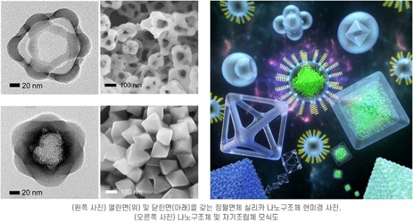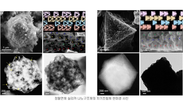 또, 연구팀은 이렇게 만든 속 빈 나노구조체들을 모아 하나의 큰 정팔면체 자기조립체를 형성할 수 있음도 확인했다. 내부에 빈 공간이 있는 이 자기조립체는 화학반응이 활발하게 일어나는 다공성 물질로서 촉매, 가스저장장치 등에 응용될 수 있다.