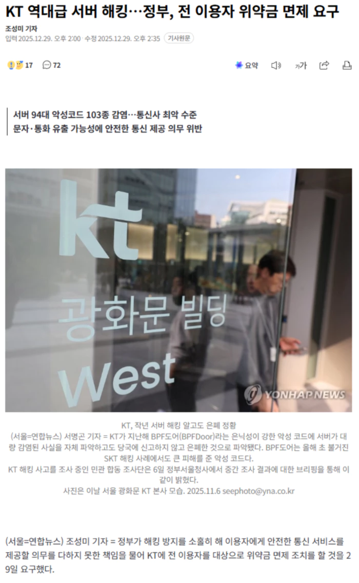 과학기술정보통신부는 이날 정부서울청사에서 서버 94대가 악성코드 103종에 감염돼 있었고 통화 정보가 유출될 위험이 있었던 KT가 이용자에 대한 위약금 면제 실시 대상에 해당한다는 내용을 골자로 한 KT 침해 사고 최종 조사 결과를 발표했다. 민관 합동 조사단이 KT 서버 3만3천대를 6차례에 걸쳐 점검한 결과 서버 94대가 BPF도어(BPFDoor), 루트킷, 디도스 공격형 코드 등 악성코드 103종에 감염돼 있었다. 역대급 통신사 해킹 사건으로 지목된 SKT의 경우 악성코드 33종에 감염됐고 공급망 보안 관리 취약으로 악성코드 1종이 서버 88대에 유입된 바 있는데 KT의 감염 범위가 더 광범위한 것이다. KT는 작년 3월 감염 서버를 발견하고도 정부에 알리지 않고 서버 41대에 대해 코드 삭제 등 자체 조치로 무마해 피해 파악이 늦어졌다. BPF도어 등 악성코드는 2022년 4월부터 인터넷 연결 접점이 있는 서버의 파일 업로드 과정의 취약점을 통해 서버에 침투한 것으로 파악됐다. 루트킷 등 악성코드는 방화벽, 시스템 로그 등 기록이 남아있지 않아 공격자의 침투 방법 등을 판단할 수 없었다. 서버 감염과 별도로 불법 초소형 기지국(펨토셀)이 통신망에 무단 접속해 국제이동가입자식별정보(IMSI), 국제단말기식별번호(IMEI), 전화번호 탈취 피해를 본 이용자는 2만2천227명, 무단 소액결제 피해자는 368명, 피해액 2억4천300만원으로 중간 조사 결과와 변동이 없었다. 다만, 통신 결제 관련 데이터가 남아있지 않은 기간인 작년 7월 31일 이전의 피해 규모는 확인이 불가능해 추가 피해 여지는 미궁으로 남게 됐다. 조사단은 경찰이 무단 소액결제범들로부터 확보한 불법 펨토셀을 포렌식 분석한 결과 이들 기기에 KT 망 접속에 필요한 KT 인증서 및 인증 서버 IP 정보와 해당 기지국을 거쳐 가는 트래픽을 가로채 제삼의 장소로 전송하는 기능이 있음을 확인했다. 여기에 단말기에서 코어망에 이르는 통신 과정에서 암호화가 풀리면서 ARS, SMS 등 결제 인증 정보가 탈취됐을 뿐 아니라 이용자의 문자, 통화 내용이 유출되는 일도 가능한 것으로 확인됐다. 특히, 아이폰 16 이하 기종 등 일부 단말기에는 KT가 암호화 설정 자체를 지원하지 않고 있었다. 조사단은 KT의 펨토셀 관리 체계가 전반적으로 부실해 불법 펨토셀이 KT 내부망에 언제 어디서든 접속할 수 있었다며 인증 서버 IP의 주기적 변경 및 대외비 관리 등 보안 관리 개선책을 요구했다. 모든 펨토셀 제품이 동일한 제조사 인증서를 사용하고 있어 이를 복사하면 정상 펨토셀이 아니더라도 KT 망에 접속할 수 있었고 타사 또는 해외 IP 등 비정상 IP를 차단하지 않고 있었으며 정상 정보인지 검증 체계도 없었기 때문이다. 과기정통부는 KT 보안 조치의 총체적인 미흡이 위약금 면제 사유에 해당한다고 판단했다. 약관에 명시된 "회사의 귀책 사유로 이용자가 서비스를 해지할 경우 위약금을 면제할 수 있다"는 규정에 부합하며 특히 평문의 문자, 음성 통화가 제삼자에게 새어나갈 위험성은 소액결제 피해를 본 일부 이용자에 국한된 것이 전체 이용자에 해당한다고 봤기 때문이다. 조사단이 로펌 등 5개 기관을 대상으로 법률 자문을 진행한 결과 4곳에서 이번 침해 사고로 KT가 안전한 통신 서비스 제공이라는 계약의 주요 의무를 위반해 위약금 면제 규정 적용이 가능하다는 법적 판단을 전달했다. 과기정통부는 KT가 위약금 면제 조치를 SKT의 사례에 준해 적용할 것으로 보고 있다. SKT는 사고 최종 조사 결과가 발표된 지난 7월 4일을 기준으로 열흘간 침해 사고 이후 해지한 고객을 포함해 위약금 면제를 적용한 바 있다. 조사단은 KT가 악성코드뿐 아니라 쉽게 탐지가 가능한 웹셸도 발견하지 못하는 등 보안 점검이 미흡했다며 서버 등 네트워크가 연결되는 장치에서 발생하는 모든 활동을 감지 분석하는 도구(EDR), 백신 등 보안 설루션 도입을 확대하라고 요구했다. .. 후략 ..
