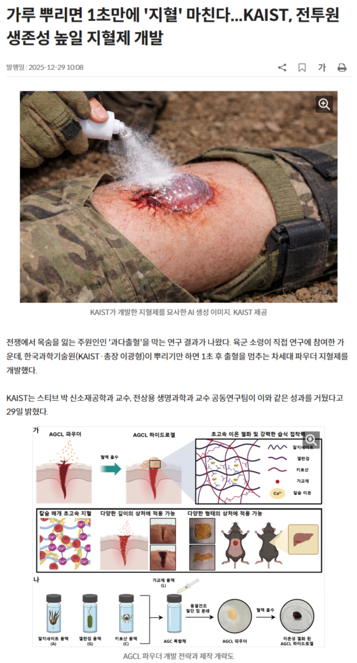 현재 의료 현장에서 널리 쓰이는 패치형 지혈제는 평면 구조여서 깊고 복잡한 상처에는 적용이 어렵고, 온도·습도에 민감해 보관과 운용에도 한계가 있었다. 이에 연구팀은 깊고 큰 불규칙 상처에도 자유롭게 적용할 수 있는 파우더 형태의 차세대 지혈제를 개발했다. 더욱이 기존 파우더 지혈제는 혈액을 물리적으로 흡수해 장벽을 형성하는 방식이어서 지혈 능력에 한계가 있었는데, 이것도 해결했다. 혈액 속 이온 반응에 주목했다. 이번에 개발한 'AGCL 파우더'는 생체적합 천연 소재를 결합한 구조로, 혈액 속 칼슘 등 양이온과 반응해 1초 만에 겔 상태로 변해 상처를 즉각 밀봉한다. 또 파우더 내부에 3차원 구조를 형성해 자체 무게 7배 이상의 혈액을 흡수할 수 있다. 이로써 혈류를 빠르게 차단하며, 손으로 강하게 눌러도 버틸 수 있는 압력 수준인 '40킬로파스칼(㎪)'이상의 높은 접착력을 보인다. 상용 지혈제보다 훨씬 뛰어난 밀폐 성능 수준이다. 자연 유래 물질로 구성돼, 혈액과 접촉해도 안전한 용혈률 3% 미만, 세포 생존율 99% 이상, 항균 효과 99.9%를 나타냈다. 동물실험에서도 우수한 조직 재생 효과가 확인됐다. .. 후략 ..
