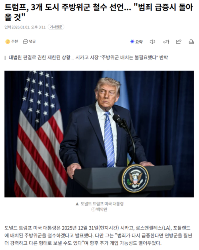 이번 발표는 미국 연방 대법원이 트럼프 행정부의 요청을 기각한 직후 나왔다. 트럼프 행정부는 시카고에 이민세관단속국(ICE) 요원을 보호하기 위해 주방위군을 배치하려 했으나, 대법원은 대통령이 국가방위군을 정규군 형태로 국내 법집행에 사용할 수 없다고 판단했다. 이는 특정 도시에서 주방위군을 통한 범죄 대응 활동이 제한된다는 의미이지, 대통령이 정규군을 국내 법집행에 전혀 사용할 수 없다고 판결한 것은 아니다. 트럼프 대통령은 성명을 통해 "시카고, LA, 포틀랜드에서 주방위군을 철수한다"며 "이 도시들의 범죄가 크게 줄어든 것은 이 위대한 애국자들 덕분"이라고 말했다. 이어 "연방정부가 개입하지 않았다면 이 도시들은 어려운 상황에 놓였을 것"이라며 "상황이 악화되면 다시 돌아올 것"이라고 강조했다. 하지만 전문가들은 트럼프 대통령의 발언을 단순한 철수 선언이 아닌 정치적 메시지로 해석한다. 대법원 판결로 대통령의 군사 개입 권한이 제한된 상황에서 트럼프 대통령이 '반란법(Insurrection Act)'과 같은 예외 조항을 언급한 것은 향후 갈등 가능성을 열어둔 발언이라는 분석이다. 이 법은 대통령이 군을 국내 소요 진압에 투입할 수 있도록 한 19세기 법률로, 권한 확대 가능성 때문에 오랫동안 논란이 되어왔다. 시카고의 브랜든 존슨 시장은 "주방위군 배치는 불필요하고 위헌적이었다. 시카고는 경찰과 폭력 개입 단체, 지역 사회 조직의 협력으로 수십 년 만에 최저 수준의 살인 사건을 기록했다"고 말했다. 실제로 시카고에서는 총격 사건과 살인 사건이 각각 약 35%, 30% 감소했다. 캘리포니아주 법무장관 롭 본타는 트럼프 대통령의 발표를 "정치적 목적의 방위군 동원"이라고 비판하며 "법치주의가 위협받고 있지만 민주주의는 굳건히 유지되고 있다. 어떤 싸움이 오더라도 물러서지 않겠다"고 밝혔다. .. 후략 ..