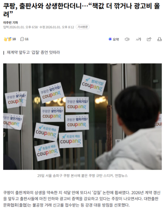 1일 출판업계 설명을 종합하면, 출협은 지난해 12월17일 회원사들에 공문을 보내 쿠팡과의 재계약 과정에서 발생하는 불공정 거래 행위를 집중 신고해달라고 요청했다. 쿠팡이 지난해 9월 출협과 상생협의체를 구성하고 불공정 거래 근절 등을 약속했는데, 이를 지키지 않고 있다는 판단에 따른 것이다. 한 출판사 대표 ㄱ씨는 “매년 연말만 되면 어떻게 쿠팡의 압박을 방어할지 고민이 깊다”고 말했다. ㄱ씨는 “통상은 공급률(소매가격 대비 납품원가) 60%로 정도 납품 계약을 맺고 저자 인세 등을 정하는데, 쿠팡이 요구하는 광고비·성장장려금을 다 들어주면 실제 공급률은 40%대까지 떨어진다”며 “쿠팡에서 판매되는 책은 별도로 정산해야 할 수준”이라고 말했다. 최근 쿠팡과 2026년도 계약을 갱신했다는 출판사 대표 ㄴ씨도 “쿠팡은 공급률을 과도하게 낮춰달라고 요구한다. 이미 낮은 수준이라 공급률을 더 낮출 수는 없다고 하면 광고비를 올리든지 성장장려금을 더 내라고 압박한다”고 하소연했다. 한번 공급률을 계약하면 동일 조건을 장기간 유지하는 기존 온라인서점과 다르게 쿠팡은 매년 계약을 갱신하고, 그때마다 조건을 변경한다. 재계약 과정에서 강압적인 분위기를 느꼈다는 증언도 나왔다. 한 출판사 직원 ㄷ씨는 “쿠팡이 일정 매출 이상 나오는 출판사 관계자들을 본사로 부른다. 명목은 ‘협상’이지만, 실제로는 ‘광고비를 두배 이상 올려라’ ‘권한이 없으면 대표를 데려와라’고 강요한다”고 말했다. 이같은 사례들이 계속되자 출협은 지난해 12월31일 회원 출판사들에 ‘쿠팡 재계약 대응 관련 안내’ 지침을 보내기도 했다. 출협은 “불합리한 조건에 성급하게 합의하지 말 것”을 당부하면서 “(계약 과정에서) 불법행위가 발생하면 출협에 신고하고 통화 및 현장 녹음, 이메일 등 증거자료를 확보”하라고 강조했다. 상황이 이렇다 보니 ‘탈팡’을 고민하는 출판사도 늘고 있다. ㄷ씨는 “쿠팡 매출이 거래처 중에 1위이긴 한데, 쿠팡이 너무 낮은 공급률을 강요해 거래를 끊는 게 이익”이라고 말했다. 매출은 줄어들지만 수익성이 개선된다는 의미다. 실제 ㄷ씨가 일하는 출판사는 쿠팡이 요구하는 조건을 거절해 2026년부터 쿠팡과의 거래를 종료하기로 했다. ㄴ씨는 “쿠팡 판매량이 많아 올해는 광고비 인상 조건을 수용했지만, 쿠팡 의존도가 커질수록 앞으로 더 힘들어질 것 같다”고 말했다. .. 후략 ..