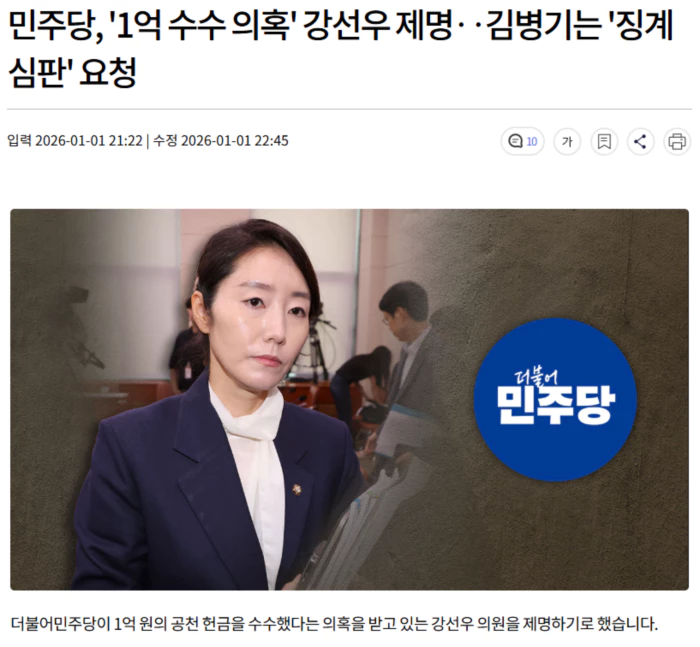 지난 29일 MBC는 강 의원 측이 2022년 지방선거 당시 후보였던 김경 서울시의원으로부터 1억 원을 받았고, 강 의원은 이런 상황을 당시 서울시당 공천관리위원회 간사였던 김병기 의원과 논의했다고 보도했습니다.