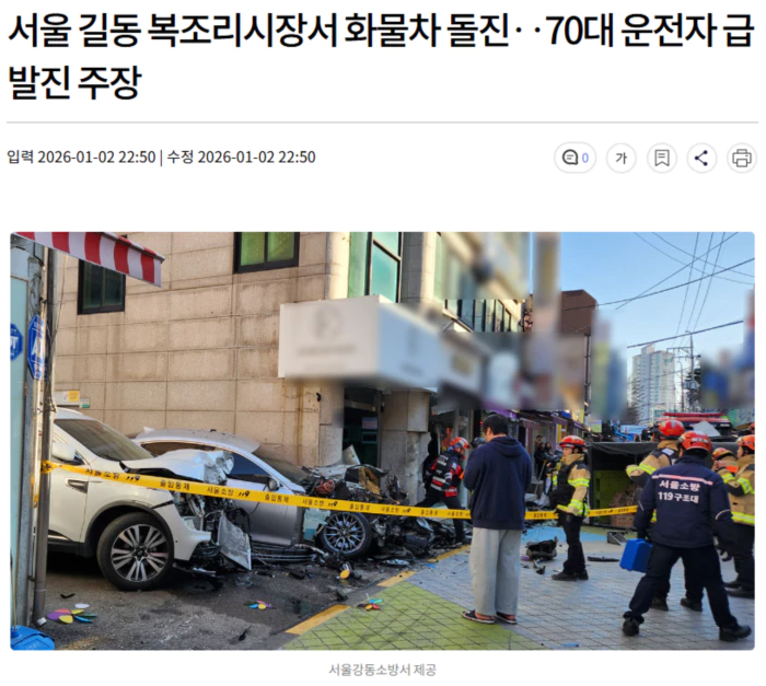 오늘(1/2) 낮 11시쯤, 서울 길동 복조리시장에서 70대 남성이 몰던 1.5톤 화물차가 갑자기 속도를 내 돌진했습니다.