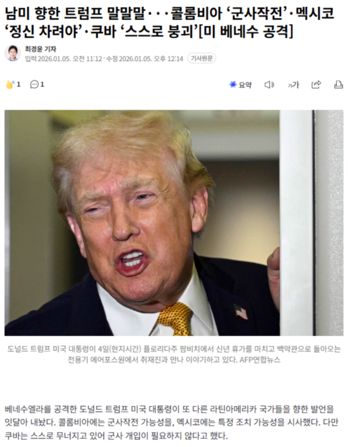 로이터통신에 따르면 트럼프 대통령은 4일(현지시간) 플로리다주 팜비치에서 신년 휴가를 마치고 백악관으로 돌아오는 전용기 에어포스원에서 ‘미국이 콜롬비아를 상대로 군사작전을 전개할 것인가’라는 취재진 질문에 “내게는 그 말이 괜찮게 들린다”고 답했다. 그는 “콜롬비아는 매우 병든 상태”라며 “코카인을 만들어 미국에 파는 병든 사람이 통치하고 있다”고 말했다. 그는 구스타보 페트로 콜롬비아 대통령을 겨냥해 “그가 그런 일을 계속하진 못할 것”이라고 했다. 트럼프 대통령은 멕시코를 향해서는 “정신 차려야 한다”고 밝혔다. 이어 “멕시코에 대해 뭔가 조치를 취해야 한다”며 개입 가능성을 시사했다. 한편 트럼프 대통령은 쿠바는 군사 개입이 불필요하다고 했다. 그는 “쿠바는 곧 완전히 무너질 것”이라며 “스스로 붕괴할 조짐이 보인다”고 말했다. 미국은 전날 이른 새벽 베네수엘라 수도 카라카스를 공습했다. 미 육군 최정예 델타포스 대원에 생포된 니콜라스 마두로 베네수엘라 대통령은 미국 뉴욕으로 강제이송됐다. 마두로 대통령은 마약 밀매를 주도했다는 혐의를 받는다. 트럼프 대통령은 전날 기자회견에서 남미 국가들에 대한 군사 개입 가능성을 내비친 바 있다. 그는 “콜롬비아는 조심해야 한다” “쿠바도 결국 우리가 이야기하게 될 나라”라고 말했다. .. 후략 ..