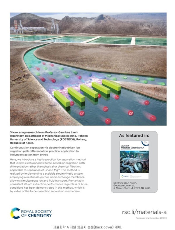 포항공과대학 기계공학과 임근배 교수·박사과정 이민수 씨·권혁진 박사 연구팀은 RIST(포항산업과학연구원, 원장 남수희) 정우철 박사와 공동으로 필터나 추출제를 전혀 사용하지 않는 전기력 기반의 리튬·마그네슘 이온 분리 방법을 개발, 재료과학 분야 국제 학술지 ‘재료화학 A 저널(Journal of Materials Chemistry A)’에 뒷표지 논문(back cover)으로 발표했다.