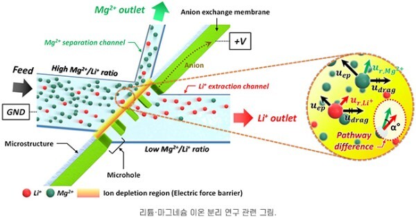 연구팀은 리튬과 마그네슘의 전기 이동도 차이에 기인해 전기력 기반의 이온 분리 메커니즘을 정립했다. 관(管)에 이온들의 진행 방향과 비스듬한 방향으로 전기장을 형성해 리튬과 마그네슘이 다른 관으로 진행하도록 유도하며 연속적으로 분리하는 데 성공했다.