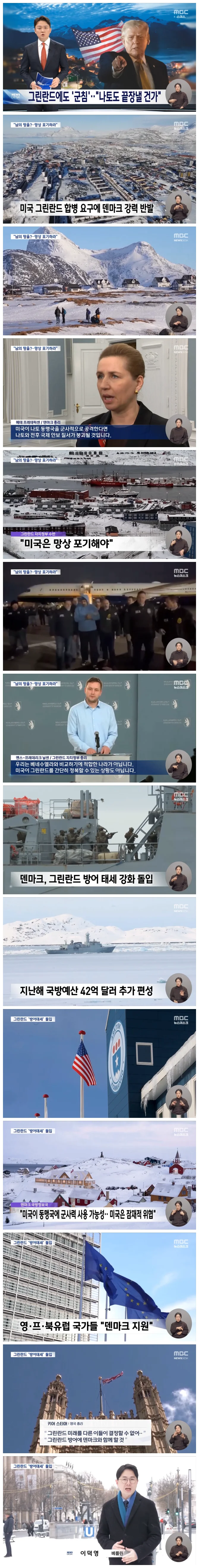그러자 이미 그린란드 방어 태세를 강화하고 있는 덴마크는, 미국이 동맹국을 공격할 경우 나토도 끝장을 볼 거라며 거세게 반발했고, 유럽 국가들도 덴마크와 연대를 선언하고 있습니다.