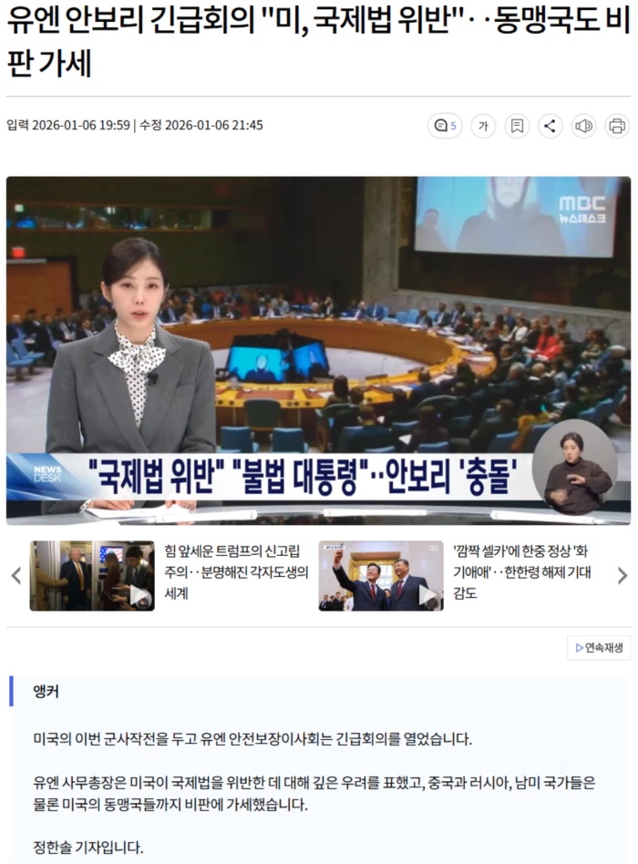 마두로 대통령 체포 사흘 만에 열린 유엔 안전보장이사회 긴급회의.