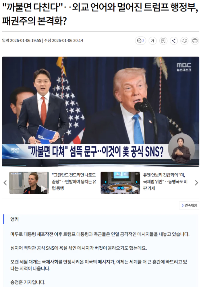 | 유엔 안보리 긴급회의 "미, 국제법 위반".. 동맹국도 비판 가세 (0) | 2026.01.06 |
