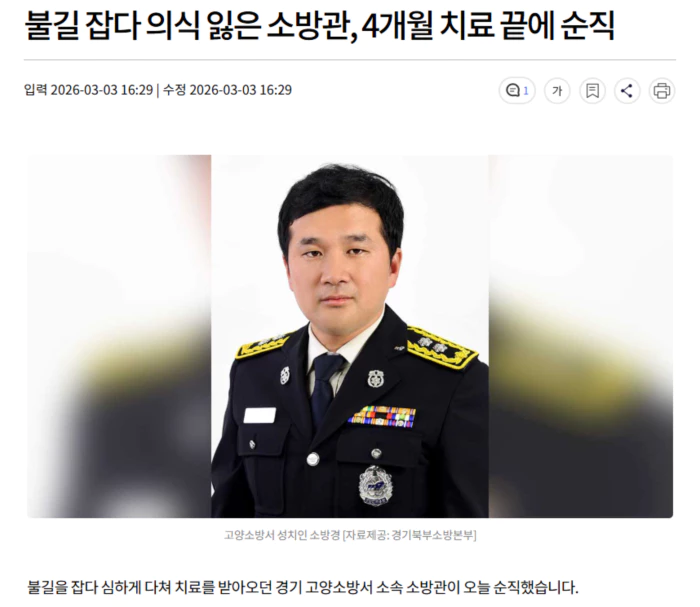 경기북부소방재난본부는 오늘 낮 1시 반쯤 고양소방서 성치인 소방경이 향년 47세로 순직했다고 밝혔습니다.