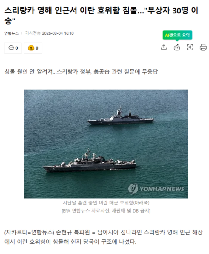 4일(현지시간) 로이터·AFP 통신 등에 따르면 비지타 헤라트 스리랑카 외무부 장관은 의회에서 이날 자국 영해 인근에서 침몰하는 이란 호위함 '아이리스 데나'호를 구조하기 위해 해군 함정 2척과 항공기 1대를 투입했다고 밝혔다.