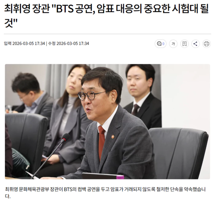 최 장관은 공연·스포츠 암표 방지 민관협의체 발대식에 참석해 "이번 BTS 공연은 암표 대응의 중요한 시험대가 될 것"이라며, "오는 21일 서울 광화문과 다음달 9일부터 12일 경기도 고양시 종합운동장에서 열릴 공연을 앞두고 철저한 암표 단속에 나서겠다"고 말했습니다.