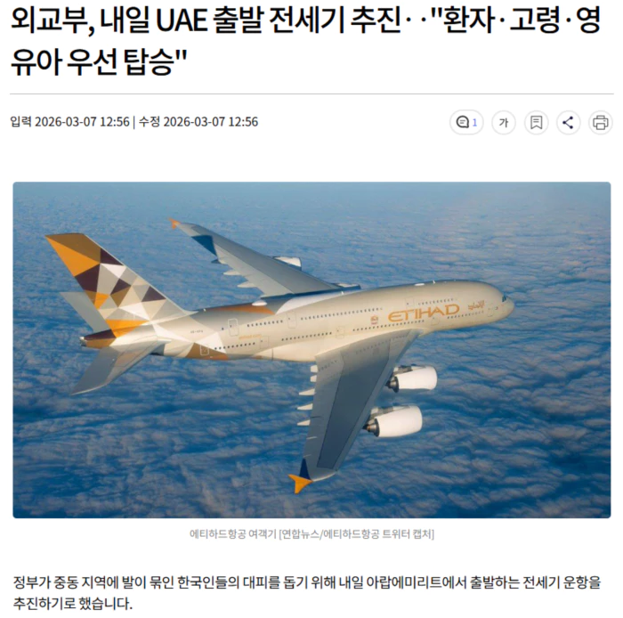 외교부는 "아랍에미리트 측과의 협의 하에 현지시간 내일 낮 12시, 한국시간 오후 5시에 출발하는 290석 규모의 에티하드 항공 전세기 운항을 추진 중"이라고 밝혔습니다.