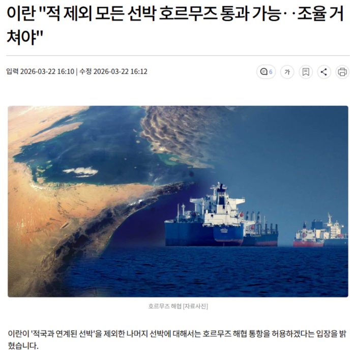 우리시간으로 오늘 오후 로이터통신에 따르면 유엔 산하 국제해사기구(IMO) 이란 대표인 알리 무사비는 반관영 매체 메흐르 통신과의 인터뷰에셔, "호르무즈 해협은 이란의 적과 언계된 선박을 제외하고 모든 선박에 개방돼 있다"고 밝혔습니다.