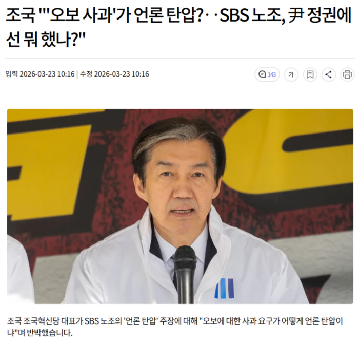 조 대표는 오늘 오전 국회에서 열린 최고위원회의 "언론 역시 유독 개혁을 거부해 왔다"면서 SBS노조를 향해 "윤석열 독재 정권이 대놓고 언론 길들이기 할 때는 왜 가만히 있었냐"고 반문했습니다.