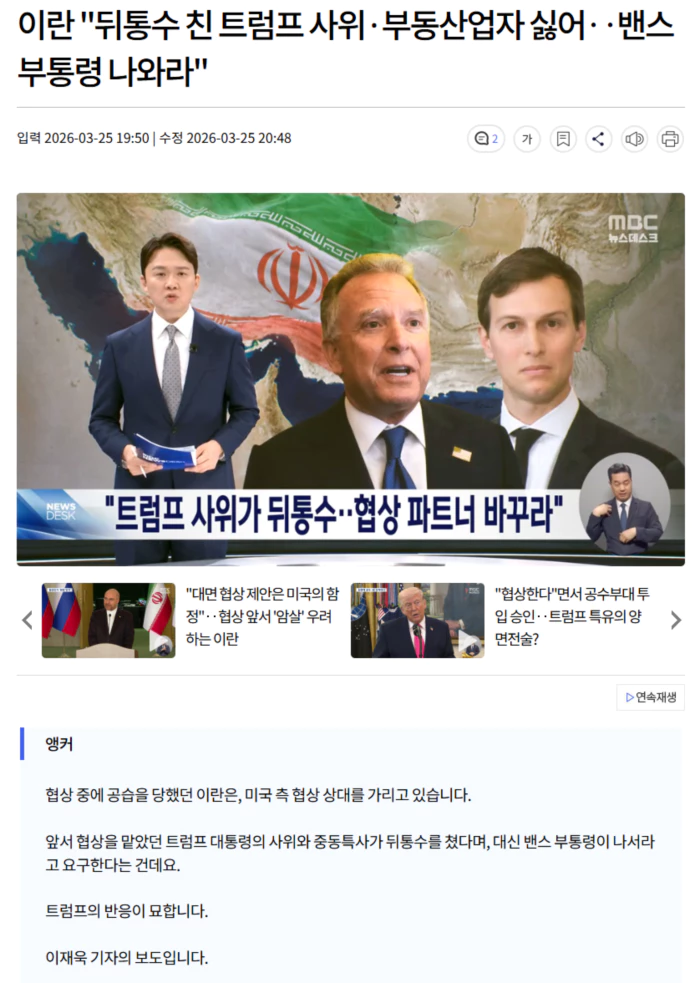 트럼프 대통령은 '이란과의 협상에 쿠슈너와 윗코프를 보낼 것이냐'는 질문에 "밴스 부통령과 루비오 국무장관도 협상에 참여하고 있다"며 즉답을 피했습니다.