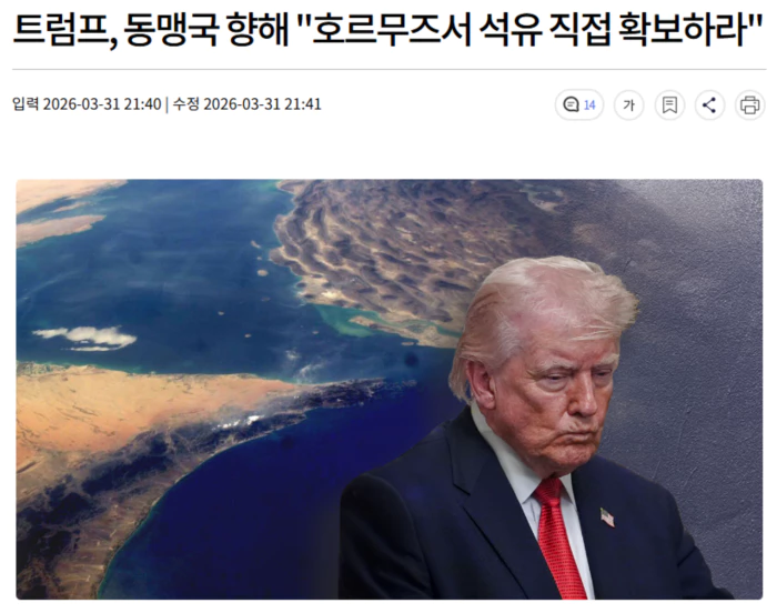 트럼프 대통령은 현지시간 31일 소셜미디어에 "이란 지도부 제거에 참여를 거부한 영국 같은 나라들에 제안을 하나 하겠다"며 미국 석유를 사든지 뒤늦은 용기라도 내 호르무즈 해협으로 가서 석유를 가져가라고 제안했습니다.