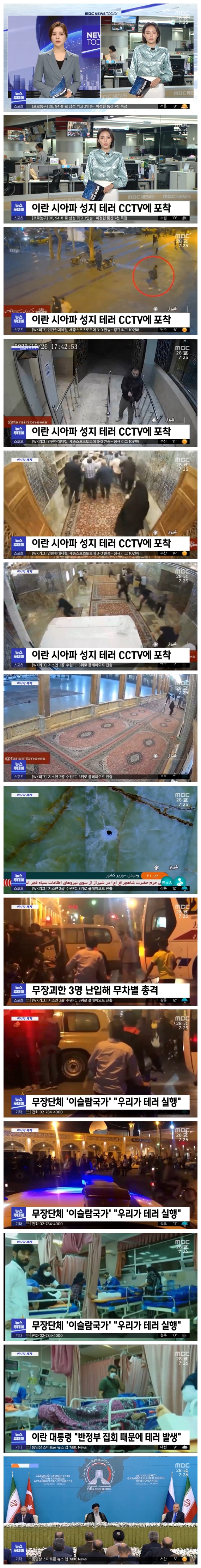 이란 중부에 있는 이슬람 시아파의 성지 '샤체라크' 영묘에서 저녁 기도 시간에 무장괴한 3명이 난입해 무차별 총격을 가한 건데요.