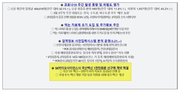 - 선구매 전제조건*을 충족한 SK바이오사이언스 국산 백신 총 1천만 회분 선구매 결정에 따른 후속 조치이다.