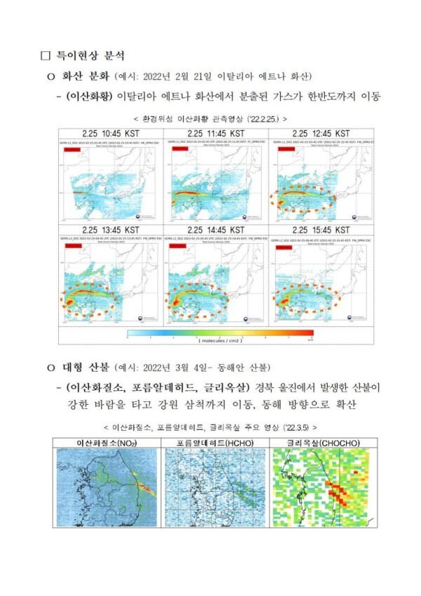 ○ 또한, 환경위성은 2022년 3월 4일부터 경북 울진 등에서 발생한 산불과 이탈리아 에트나, 일본 아소산, 인도네시아 시나붕 화산 분화 등 재난에 의한 전 지구적 대기오염 감시를 성공적으로 수행하고 있다.