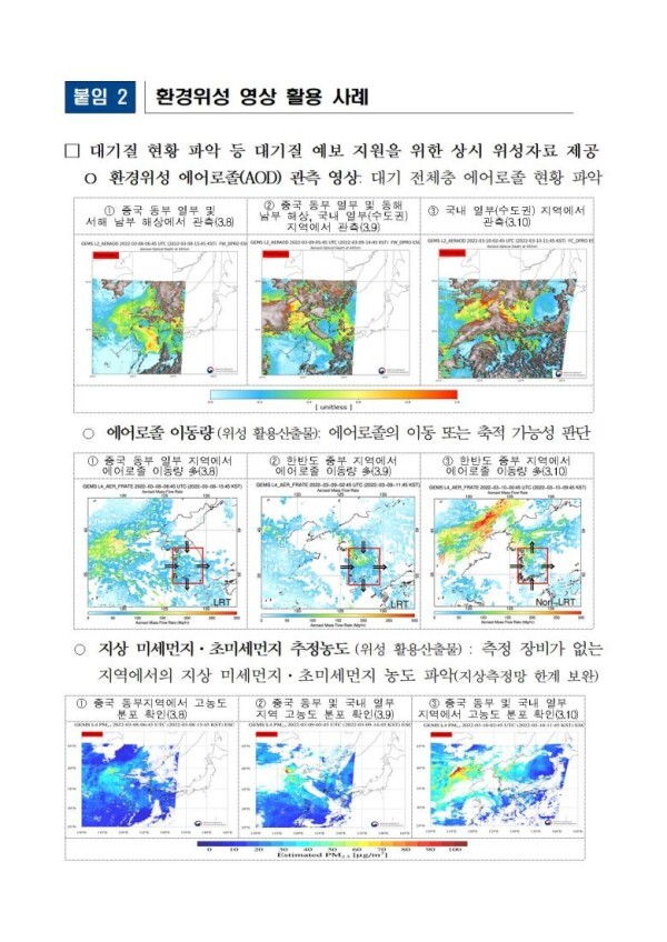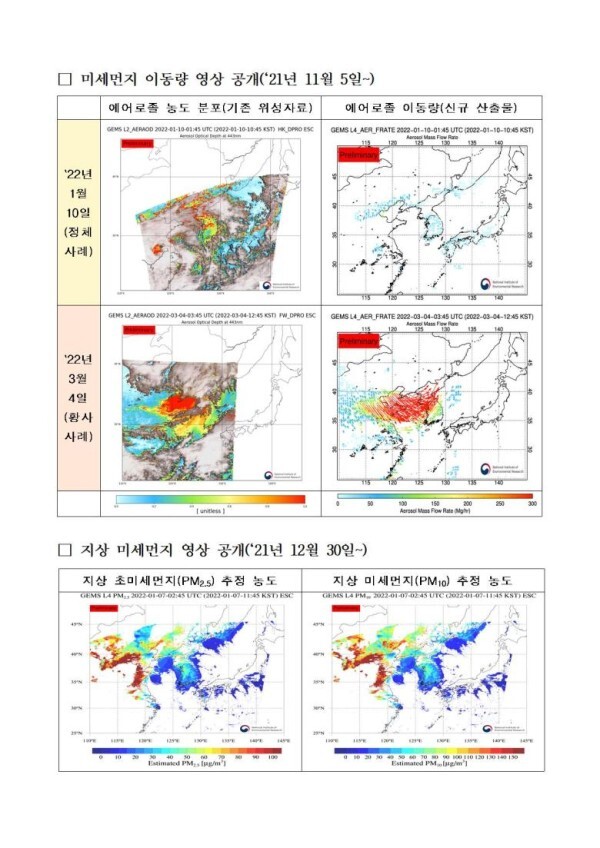 ○ 아울러, 환경위성의 활용도를 높이기 위해 2021년 11월 5일부터 ‘에어로졸 이동량 영상’을 공개하고, 2021년 12월 30일부터 ‘지상 초미세먼지(PM2.5)와 미세먼지(PM10) 추정 농도 영상’을 공개하고 있다.