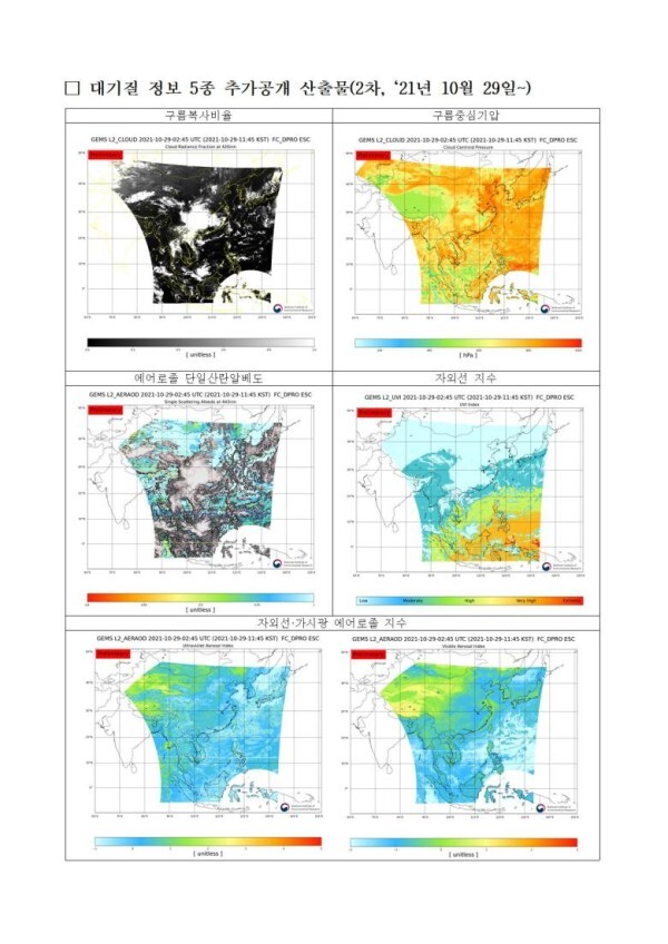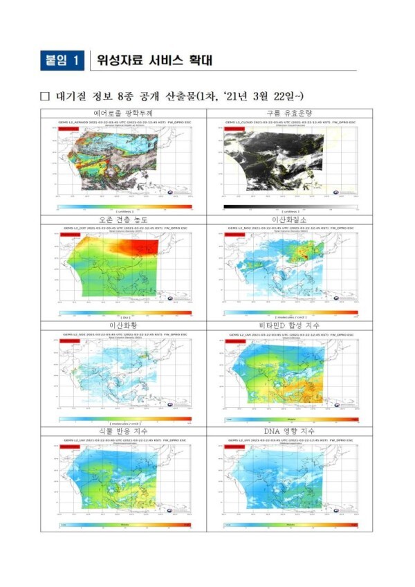 * 이산화질소 농도, 에어로졸(AOD), 오존 농도, 유효 운량, 자외선 관련 산출물 3종(식물 반응 지수, 비타민D 합성 지수, DNA 영향 지수), 이산화황 농도