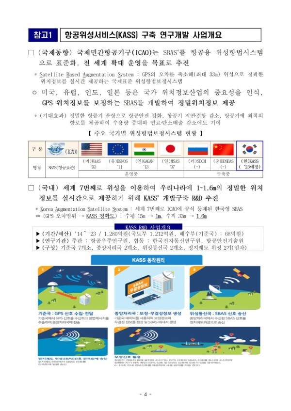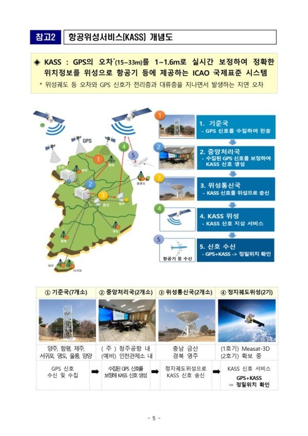 □ 국토교통부는 GPS 위치오차를 1~1.6m 수준으로 획기적으로 줄여 우리나라 전역에 정밀한 위치정보 서비스를 제공하기 위한 한국형 항공위성서비스(KASS)* 신호를 12월 15일 첫 제공할 예정이라고 밝혔다.