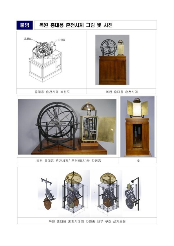 또한 혼천시계(통천의)는 홍대용의 저서를 통해 혼천의와 자명종의 제원과 천문현상에 맞는 수학적 특성이 서술되었으나, 문헌만으로 전체의 형태를 추정하는데 어려운 한계가 있었다. 연구진은 고려대학교박물관 및 서울대학교박물관의 자명종에 공통적으로 나타나는 동력발생의 특성을 분석하고, 숭실대학교 한국기독교박물관의 혼의 유물을 토대로 복원모형 설계와 작동모형 제작에 활용했다.