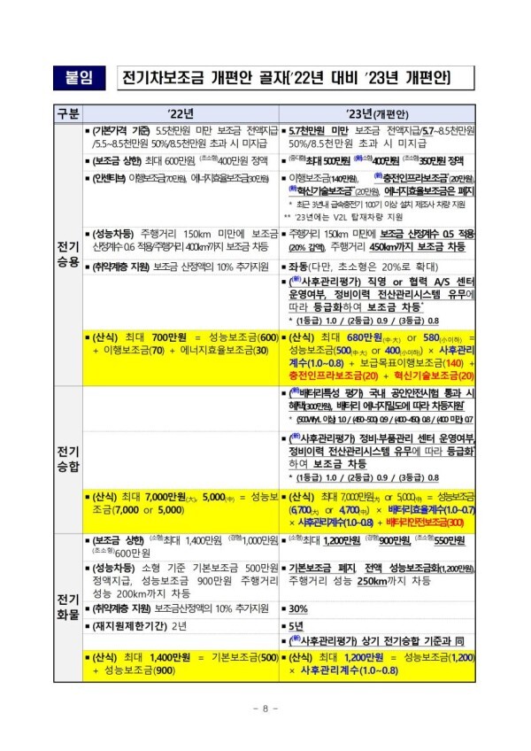 - 산업통상자원부(장관 이창양), 환경부, 기획재정부는 2월 2일 관계부처 합동으로 ‘2023년 전기차 구매보조금 개편방안(이하 보조금 개편안)’을 확정해 공개했다.