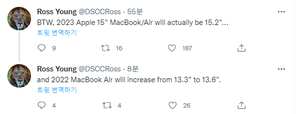 트윗으로 2023 애플 15인치 맥북의 패널 크기가 15.2인치가 될 것이라고 하고,