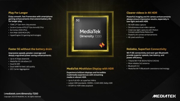 Dimensity 7200은 2023년 1분기에 글로벌 시장에 출시되는 5G 디바이스에 탑재될 예정입니다.