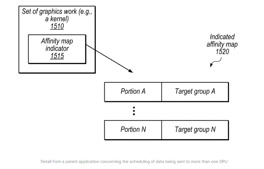 그리고 "그래픽 작업 세트의 일부를 그래픽 프로세서 하위 장치 그룹에 소프트웨어로 표시된 매핑을 할 수 있습니다."라고 Apple은 이 출원서에서 말합니다.