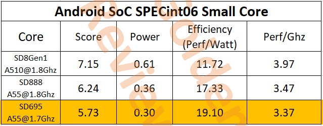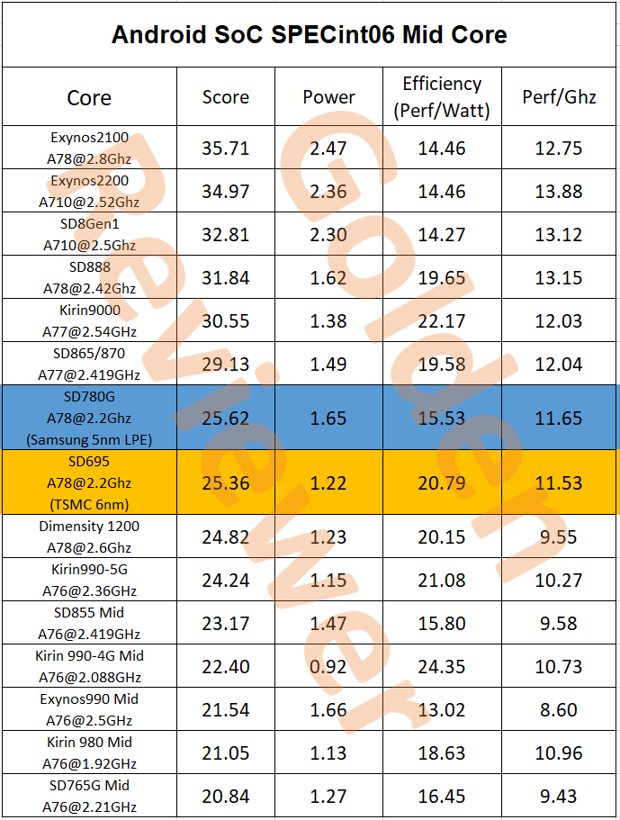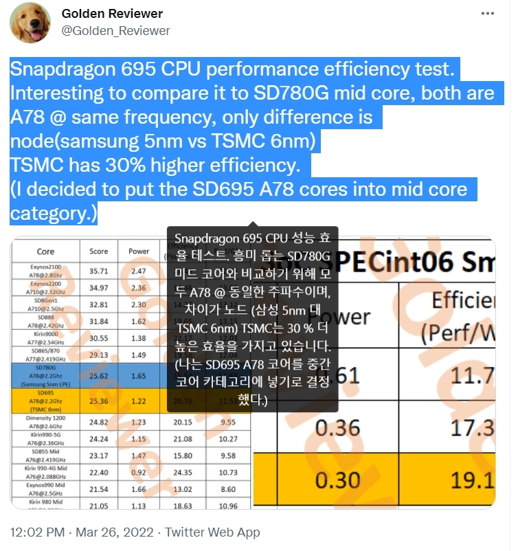 IT 유튜버 및 트위터리안 Golden Reviewer에 의하면 CPU 성능 효율성 테스트에서 TSMC 6nm 공정으로 제조된 스냅드래곤 695가 삼성 5nm 공정으로 제조된 스냅드래곤 785G보다,