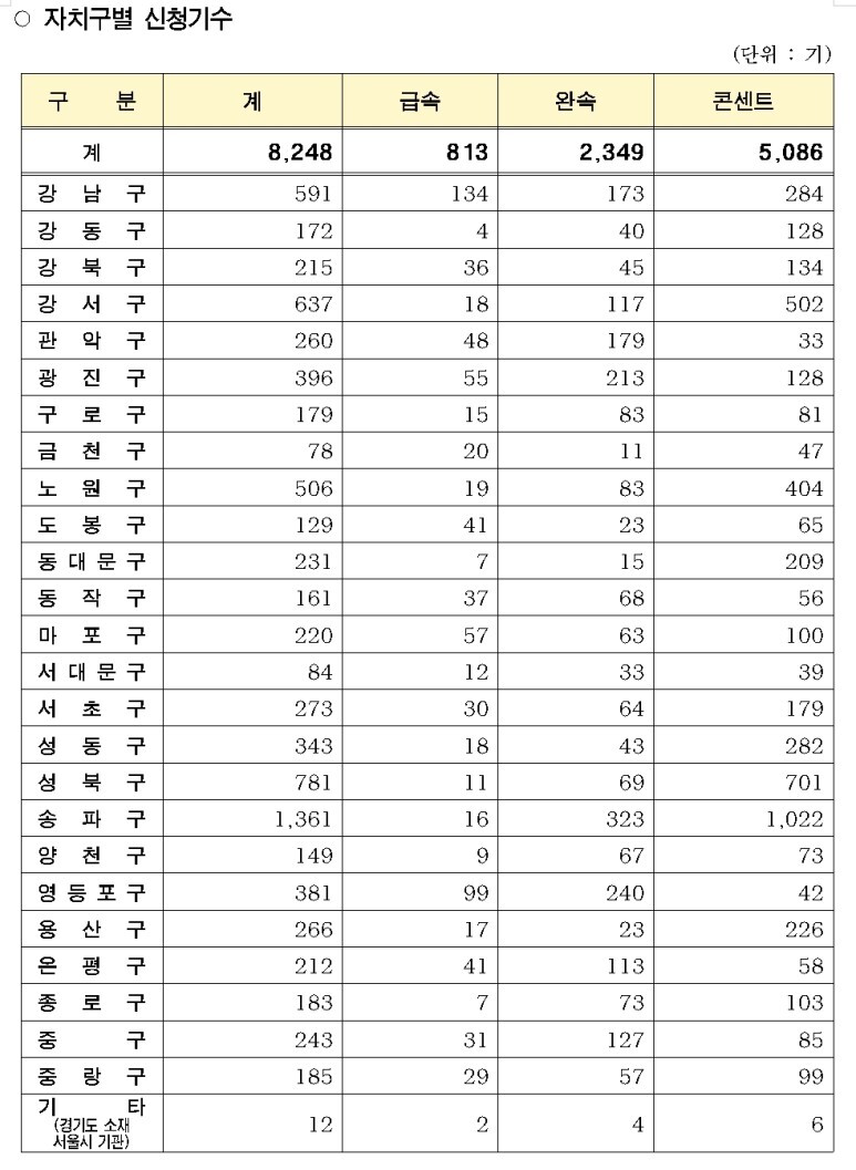 □ 자치구별로는 공동주택 비율이 높은 송파구 1,361기(16.5%), 성북구 781기(9.5%), 강서구 637기(7.7%) 순으로 많이 신청하였다.