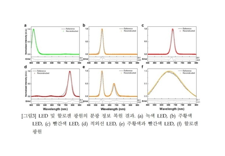 ∘ CMOS 이미지 센서를 통해 측정된 36개의 빛의 세기를 수학적 최적화 기술을 활용하여 500 – 850 nm 파장 범위 350개의 분광 정보로 복원했다. 단색광, LED 광원, 할로겐 광원 등 다양한 광원에 대한 분광 성능을 광학 실험을 통해 검증했다.